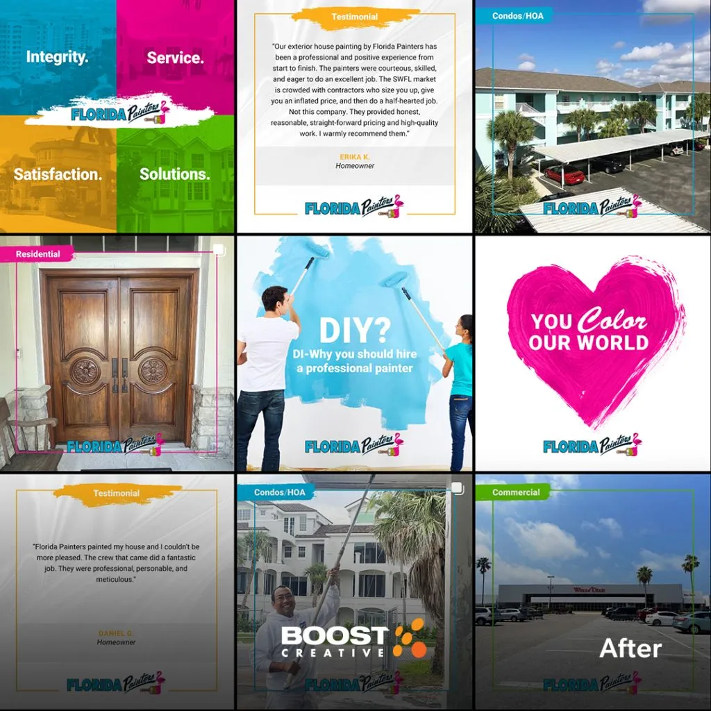 As part of Florida Painter’s current social media retainer, we create and publish a diverse range of content multiple times a week. These posts cover topics such as showcasing their work, sharing customer testimonials, providing company updates, and more. We work closely with them to plan their monthly content calendar and collaborate with our creative team to design graphics that complement their brand and highlight their business and the work they do.